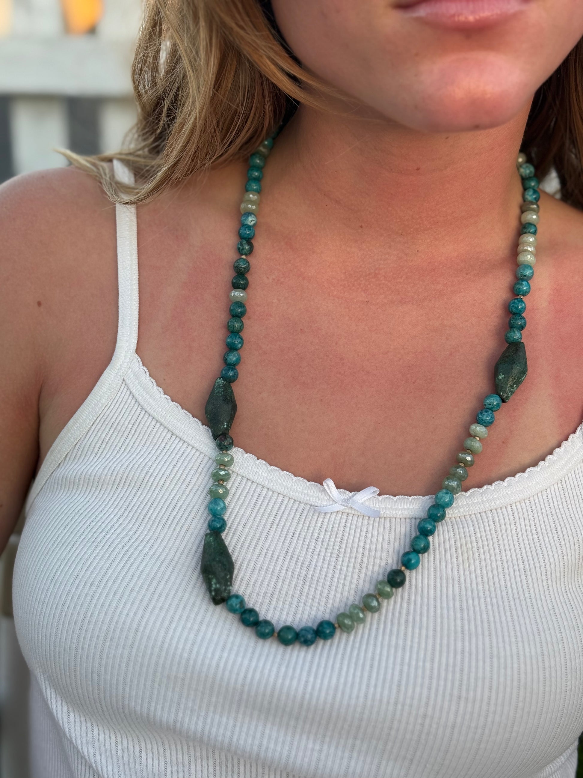 This one-of-a-kind beauty is handmade using chrysacola, aqua silverite, 18k gold dipped pyrite, and vintage African trade beads
