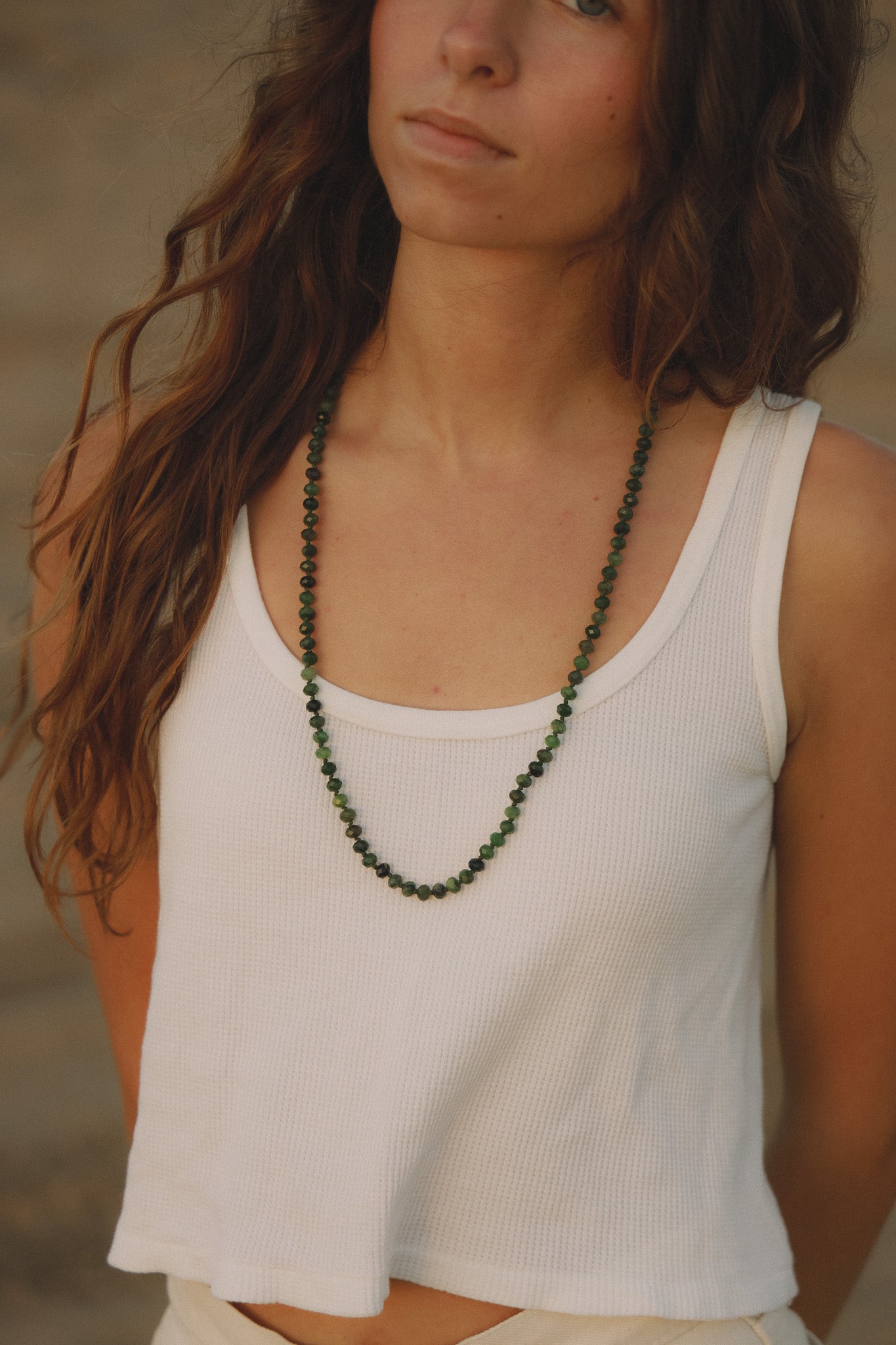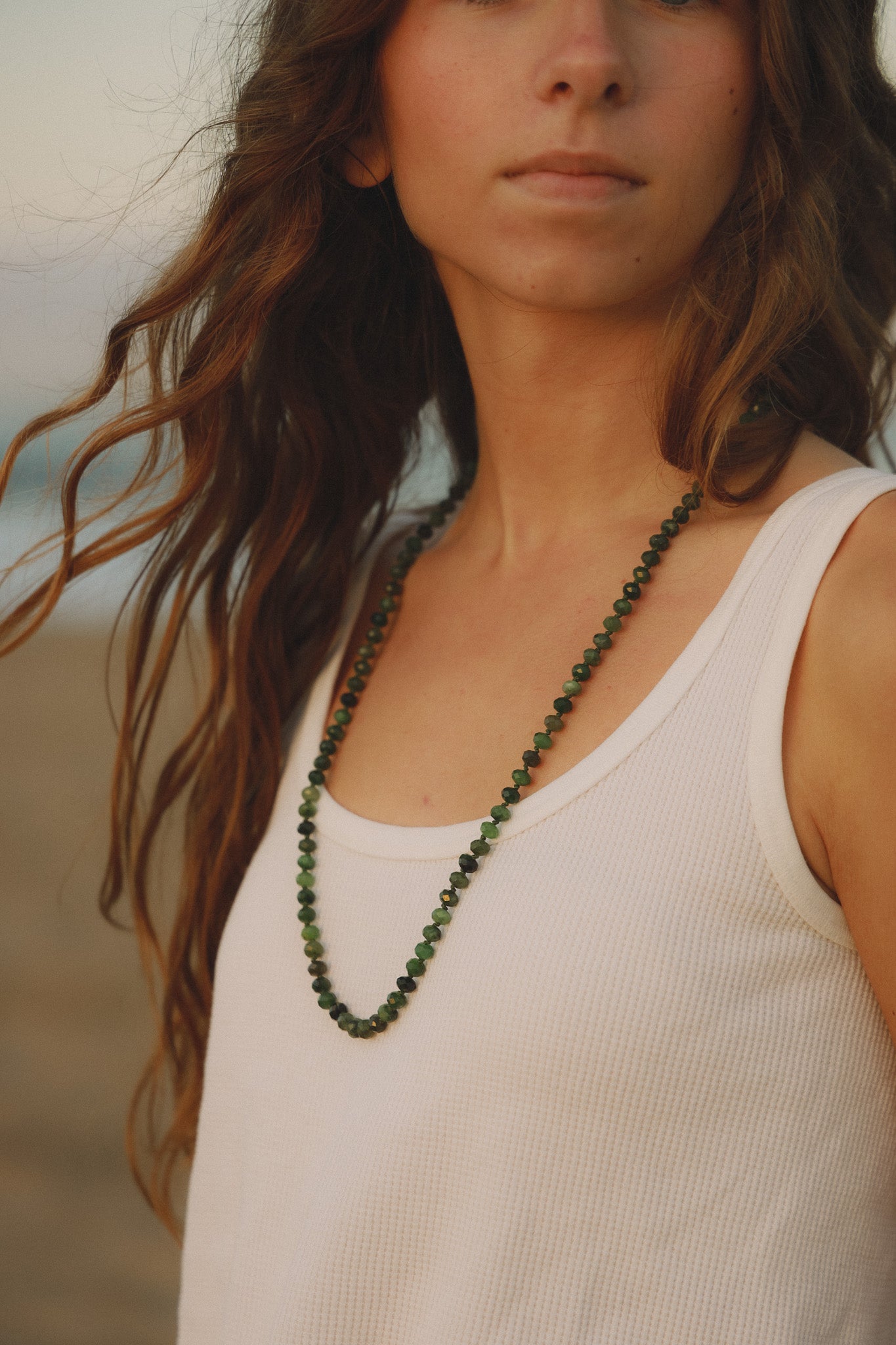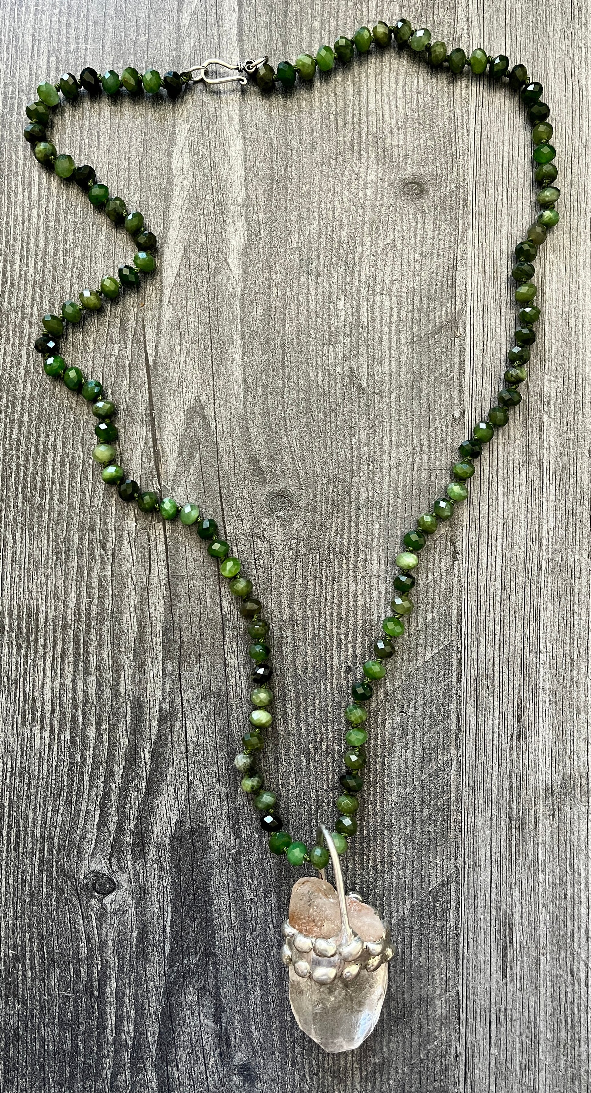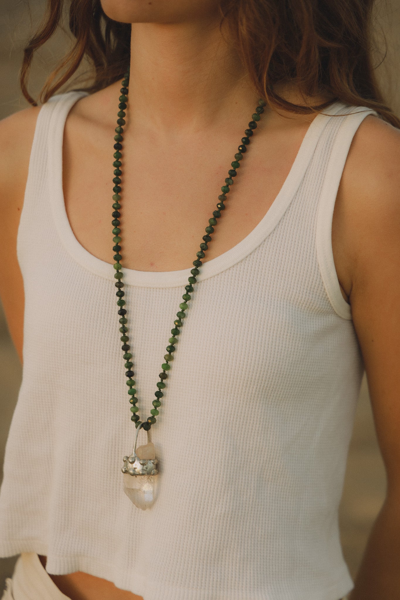 Green chalcedony beaded necklace, joined with a large raw quartz crystal to promote healing and protection.