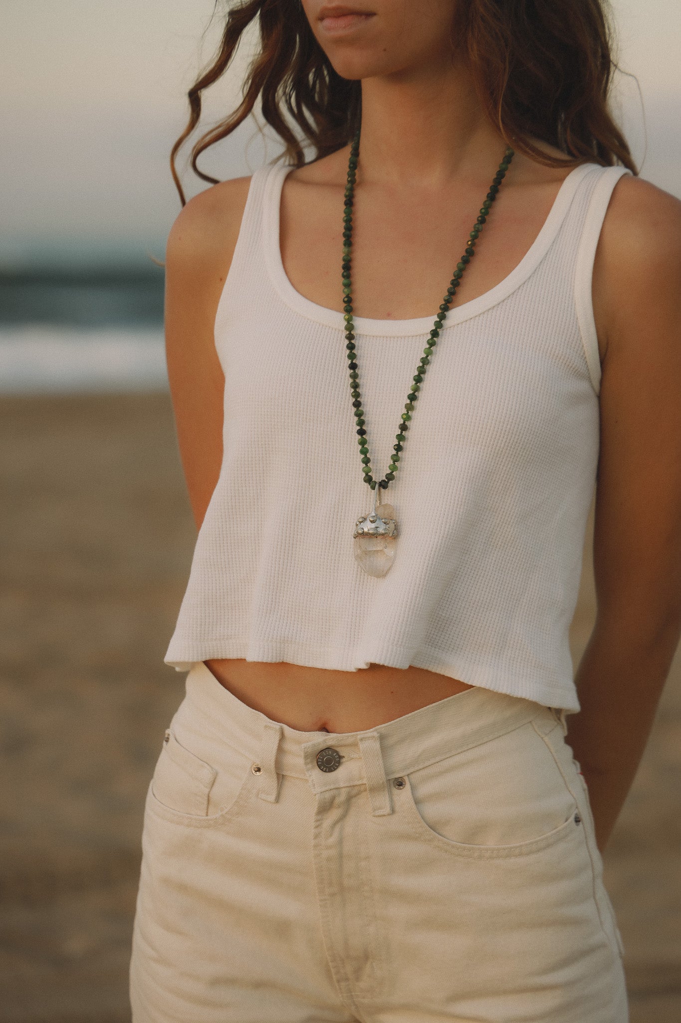 Wear the quartz crystal for impact or take it off and let the chalcedony beads speak for themselves.