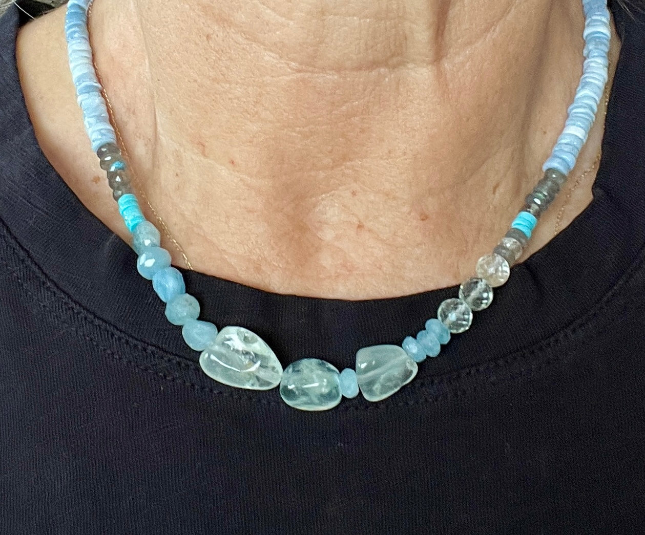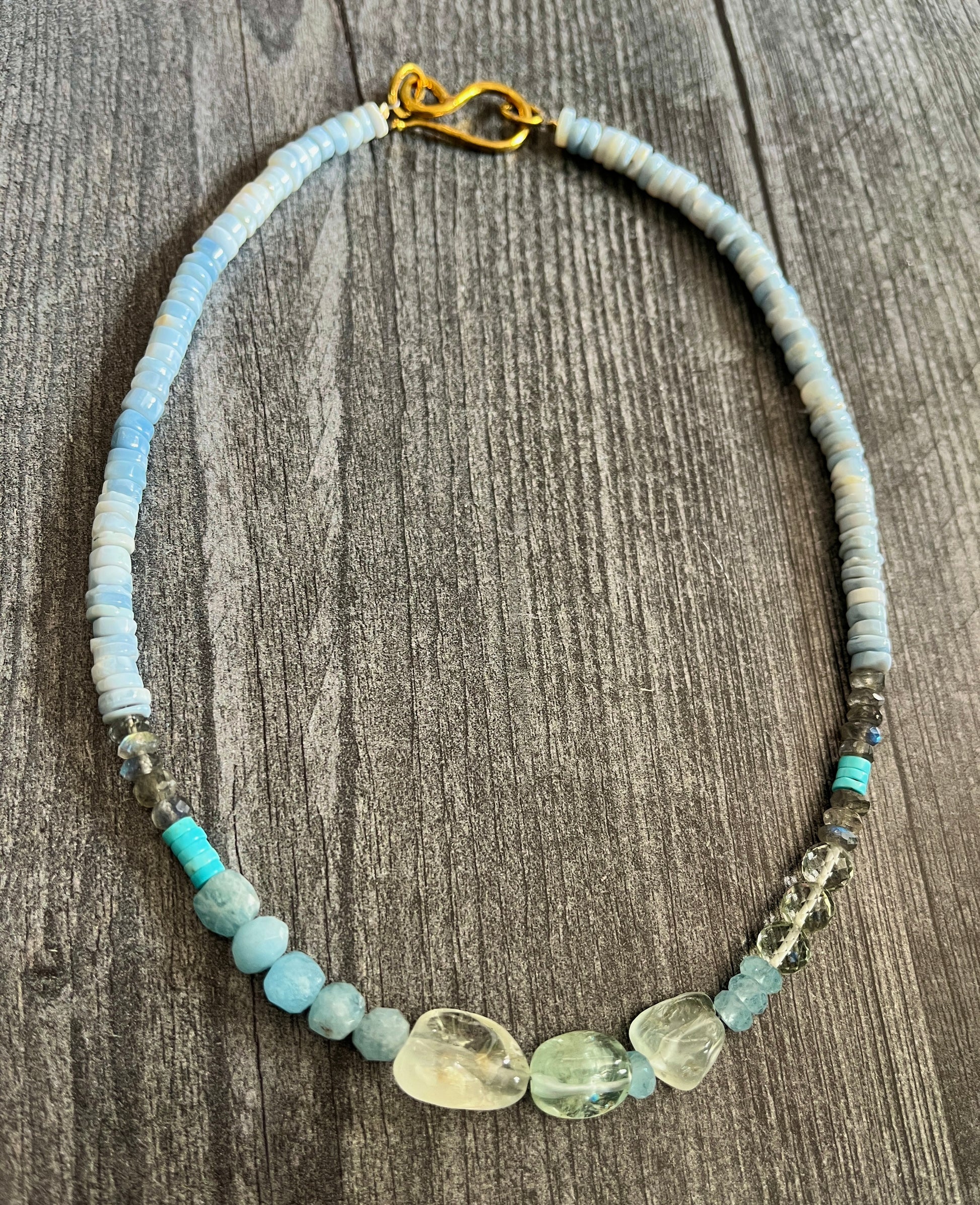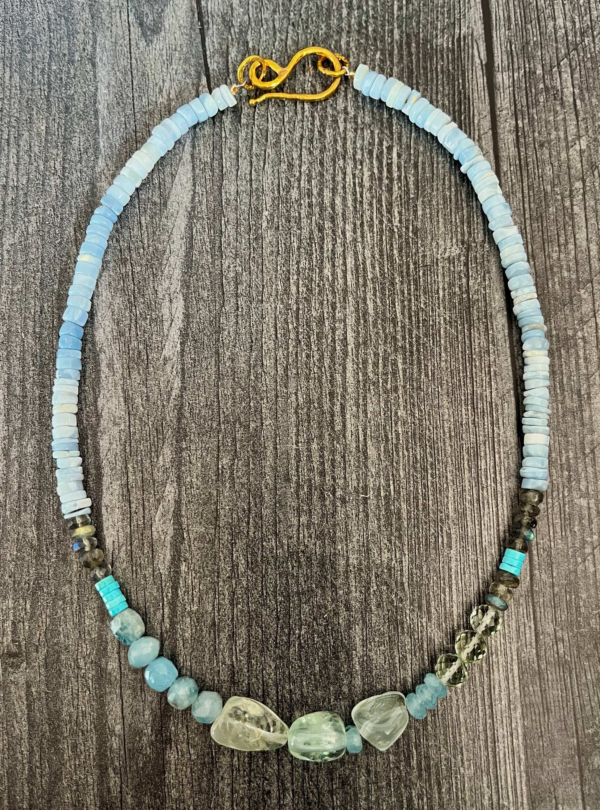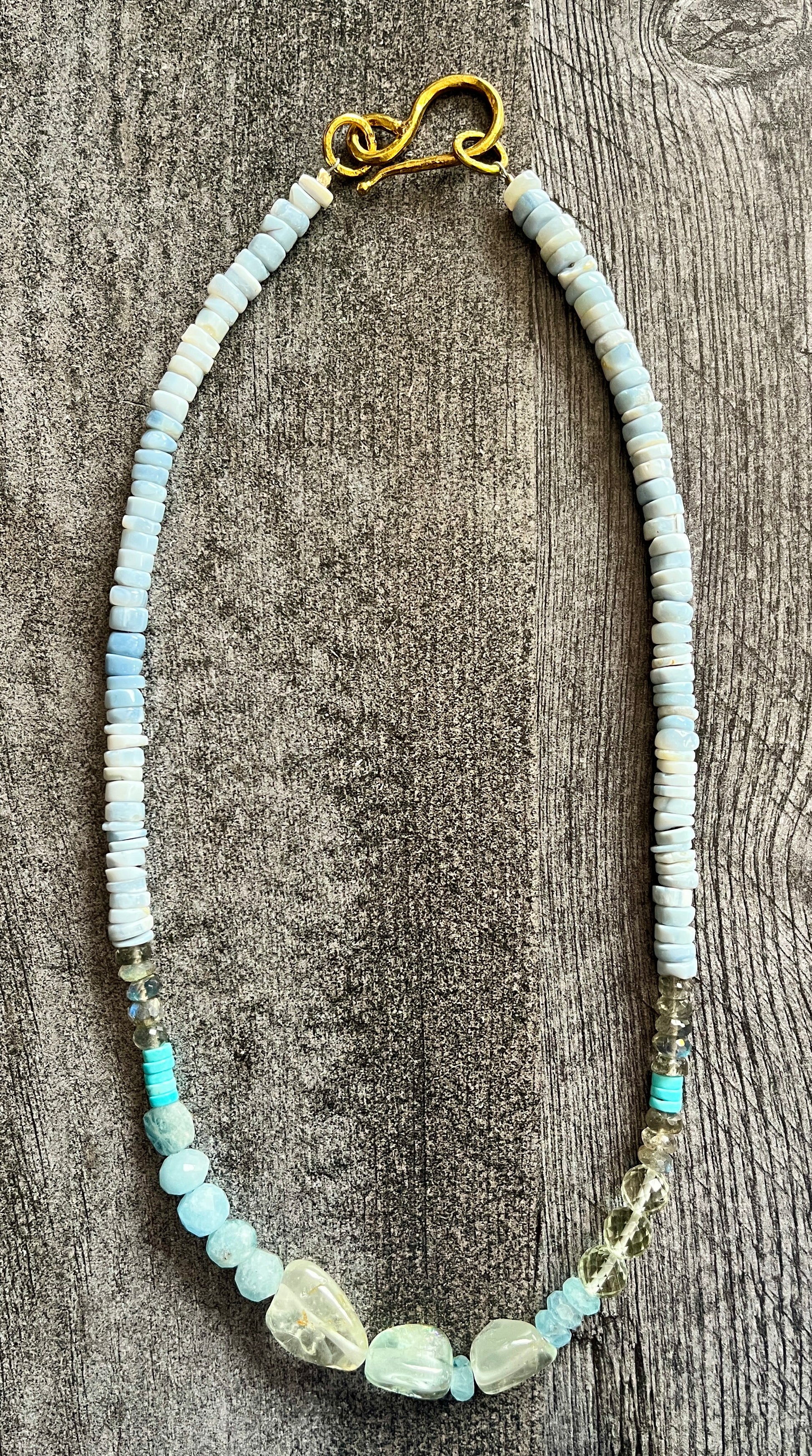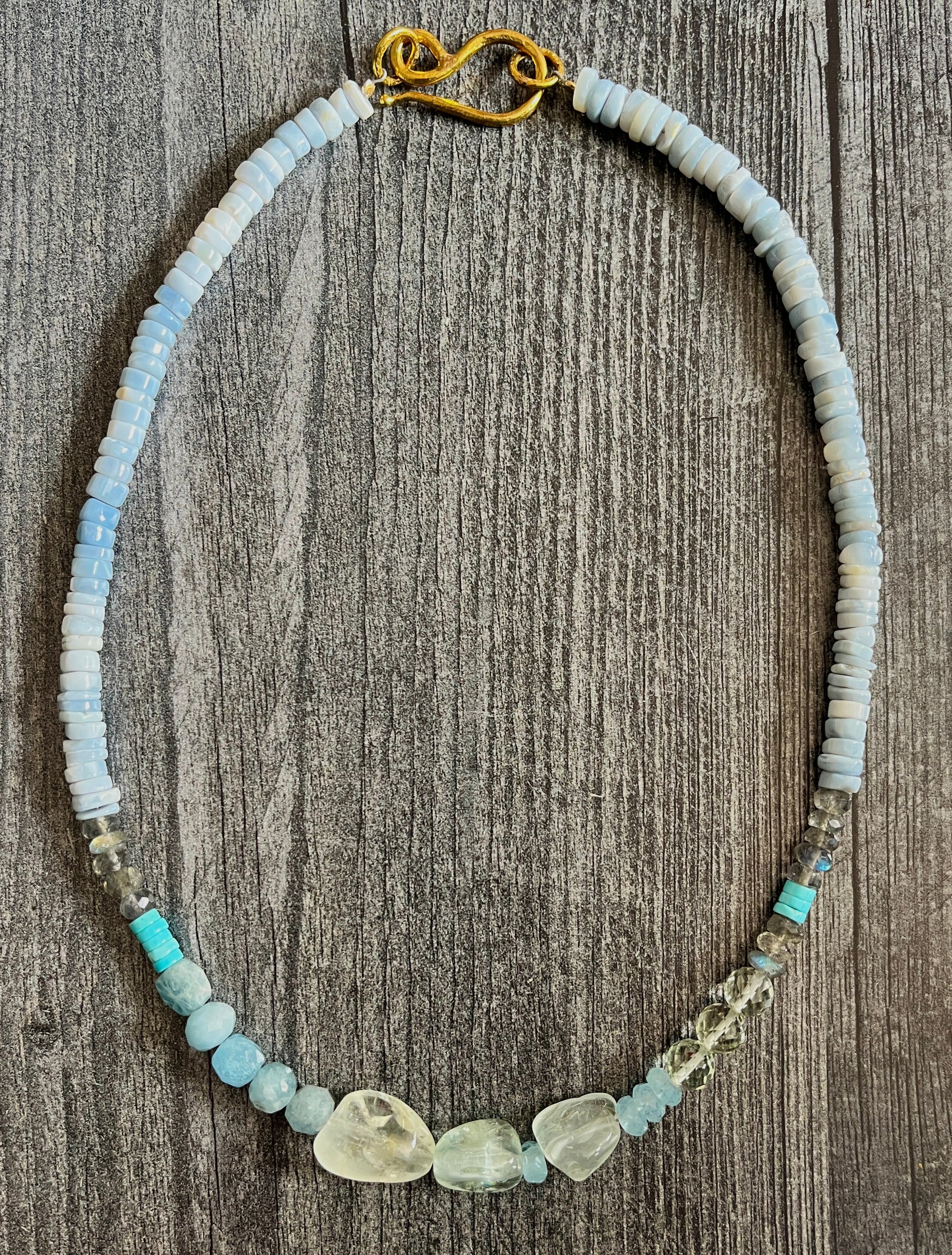 heishi cut blue opal with a pattern of labradorite, turquoise, aquamarine
