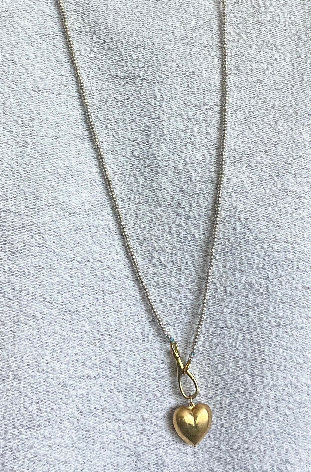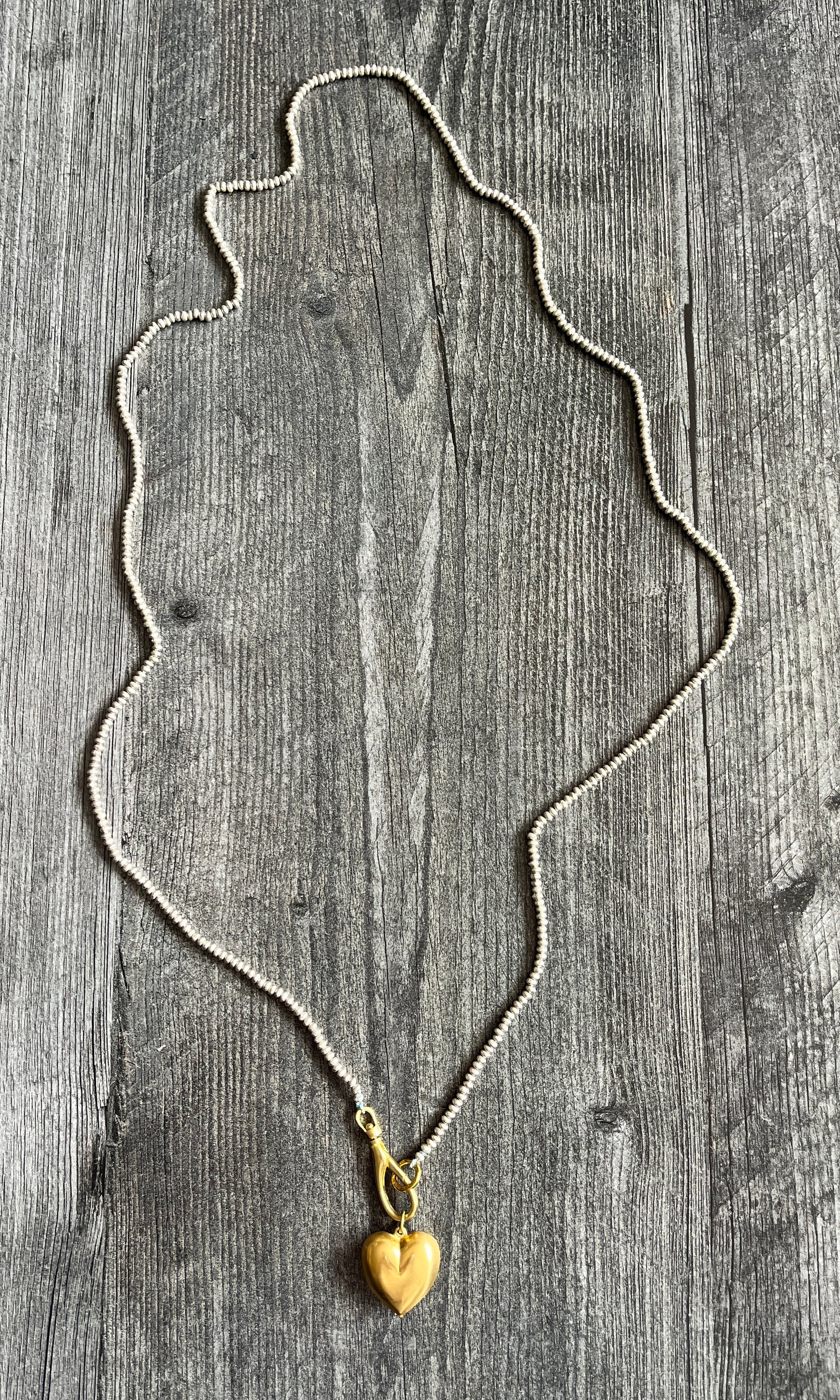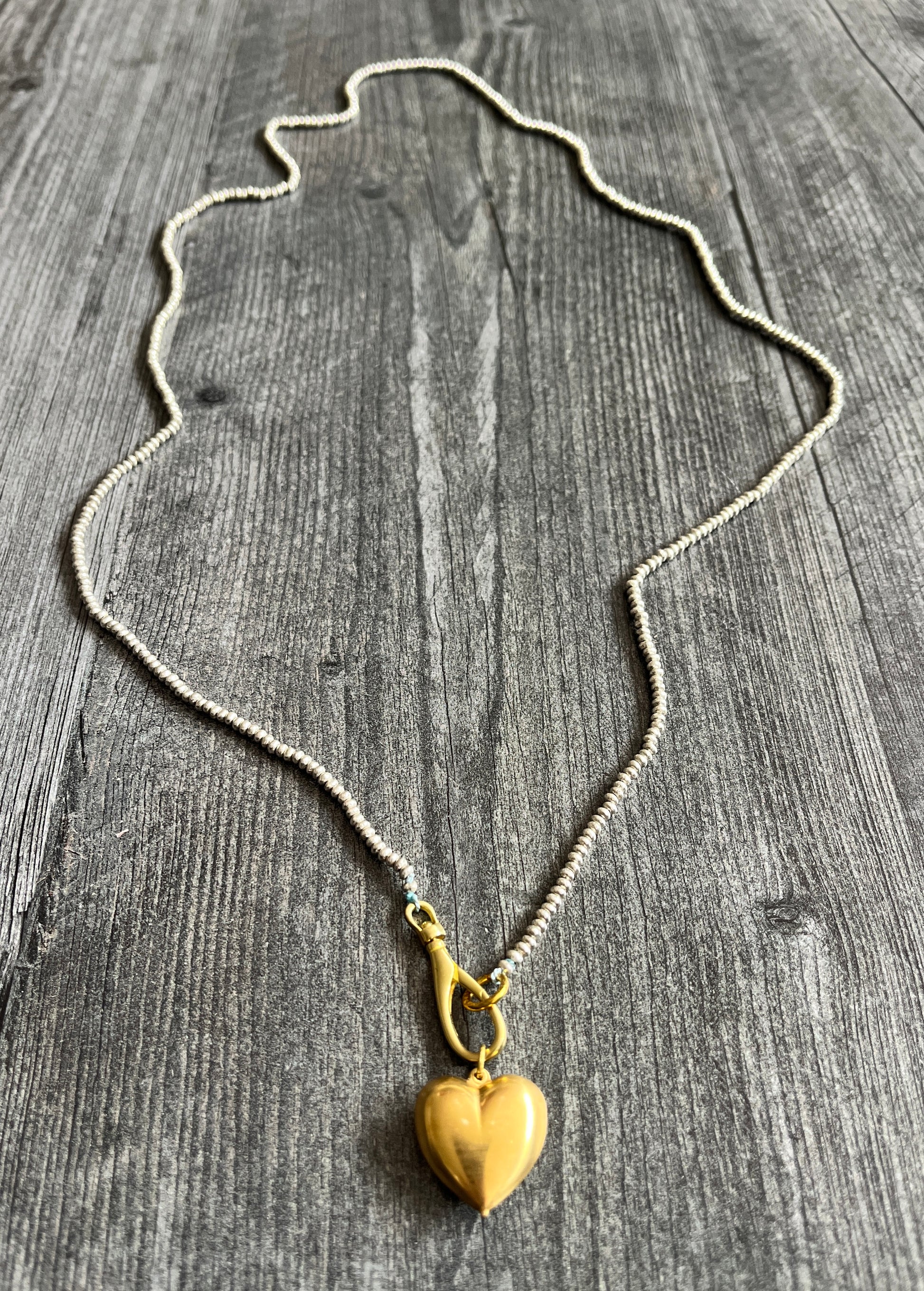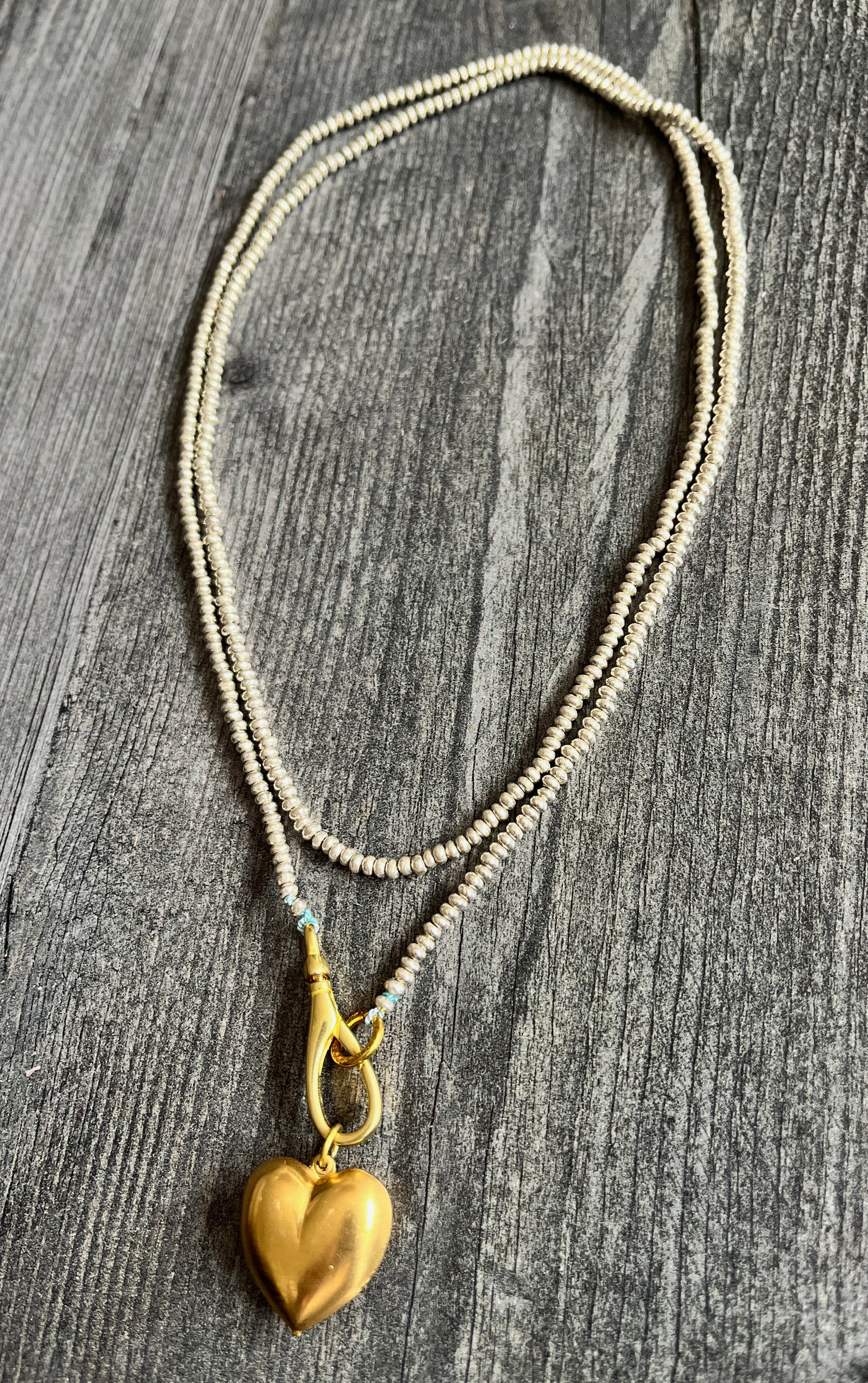 The brass puffy heart contrasts beautifully with the tiny silver beads strung by hand on silk