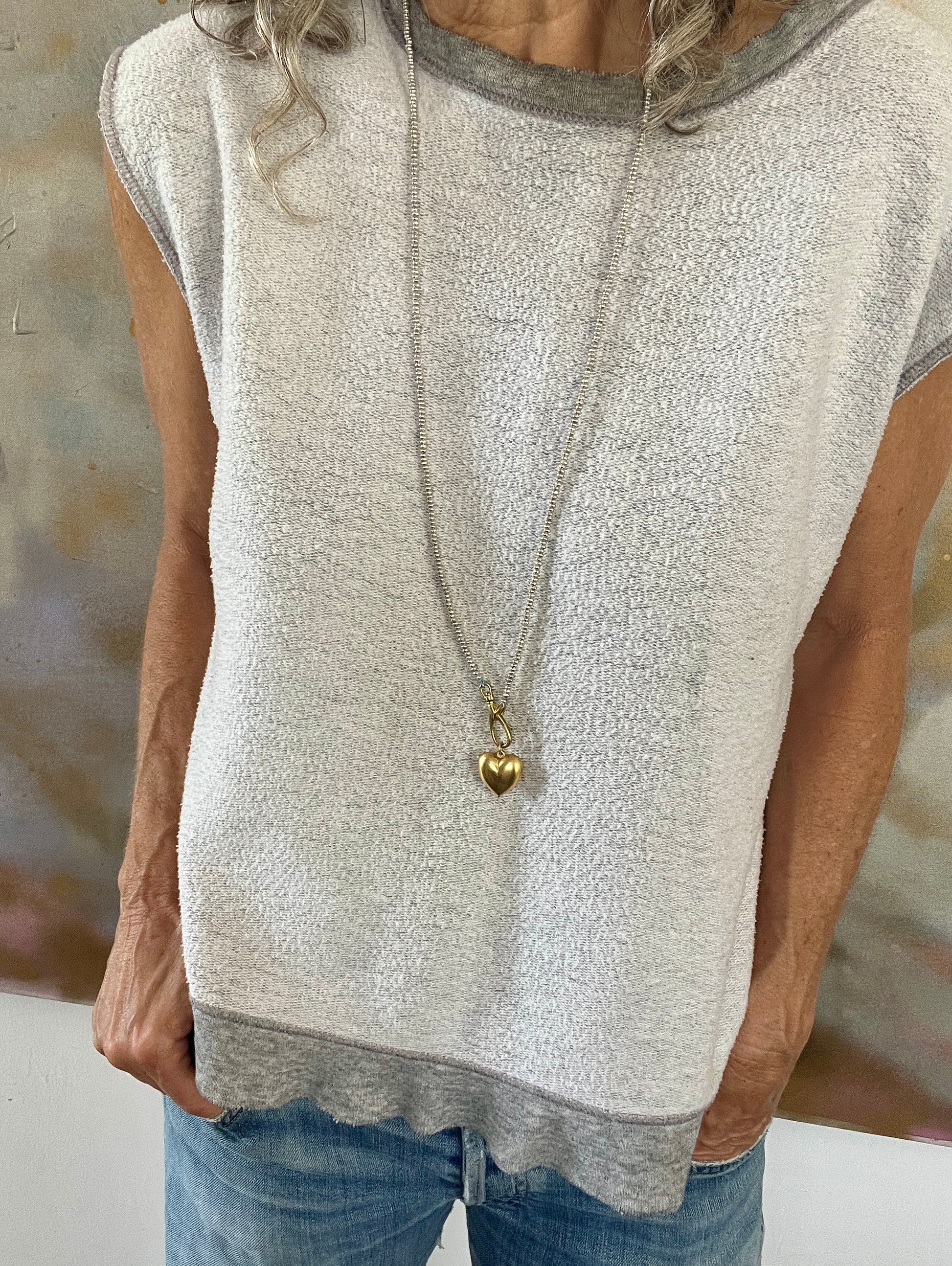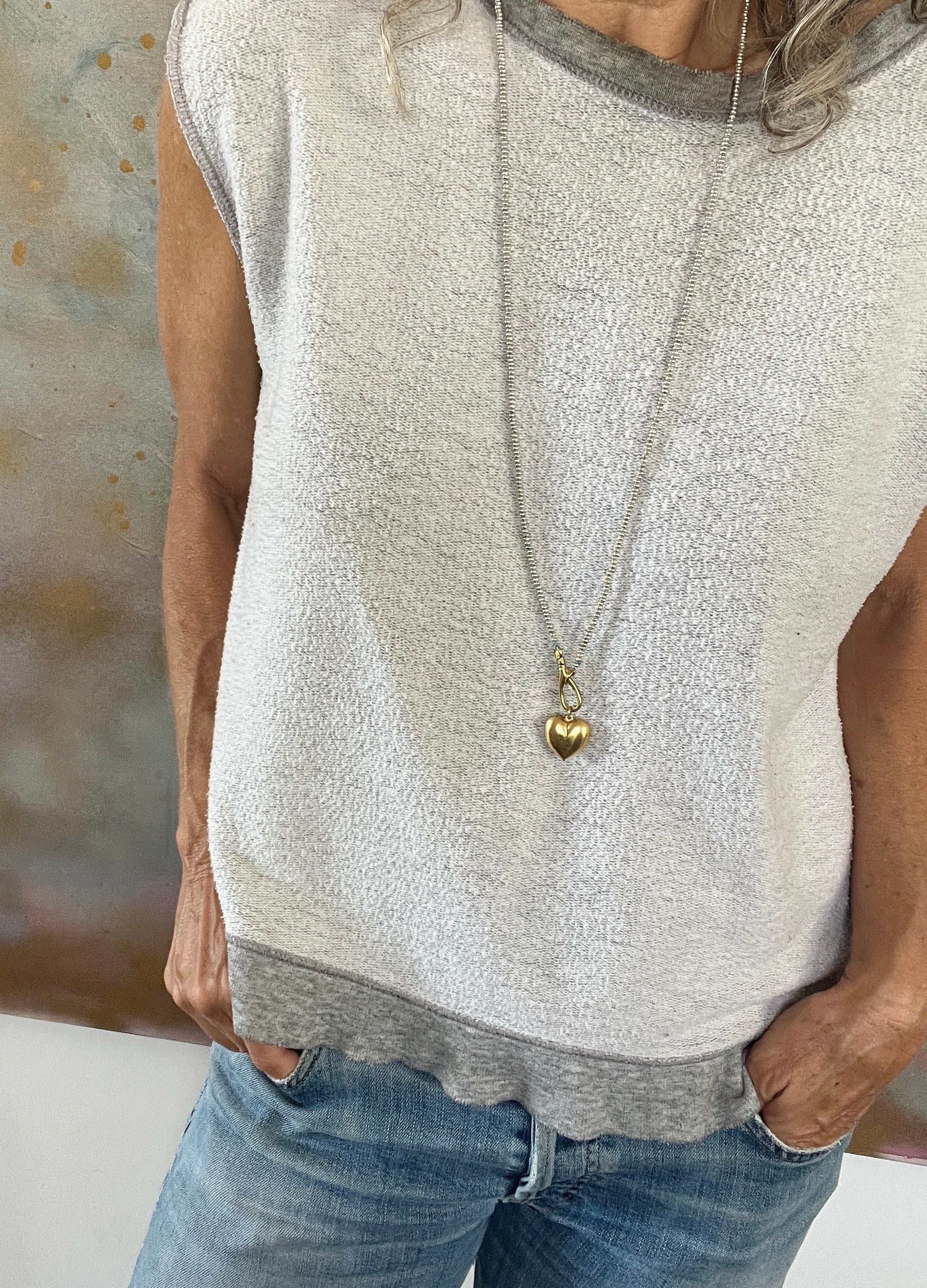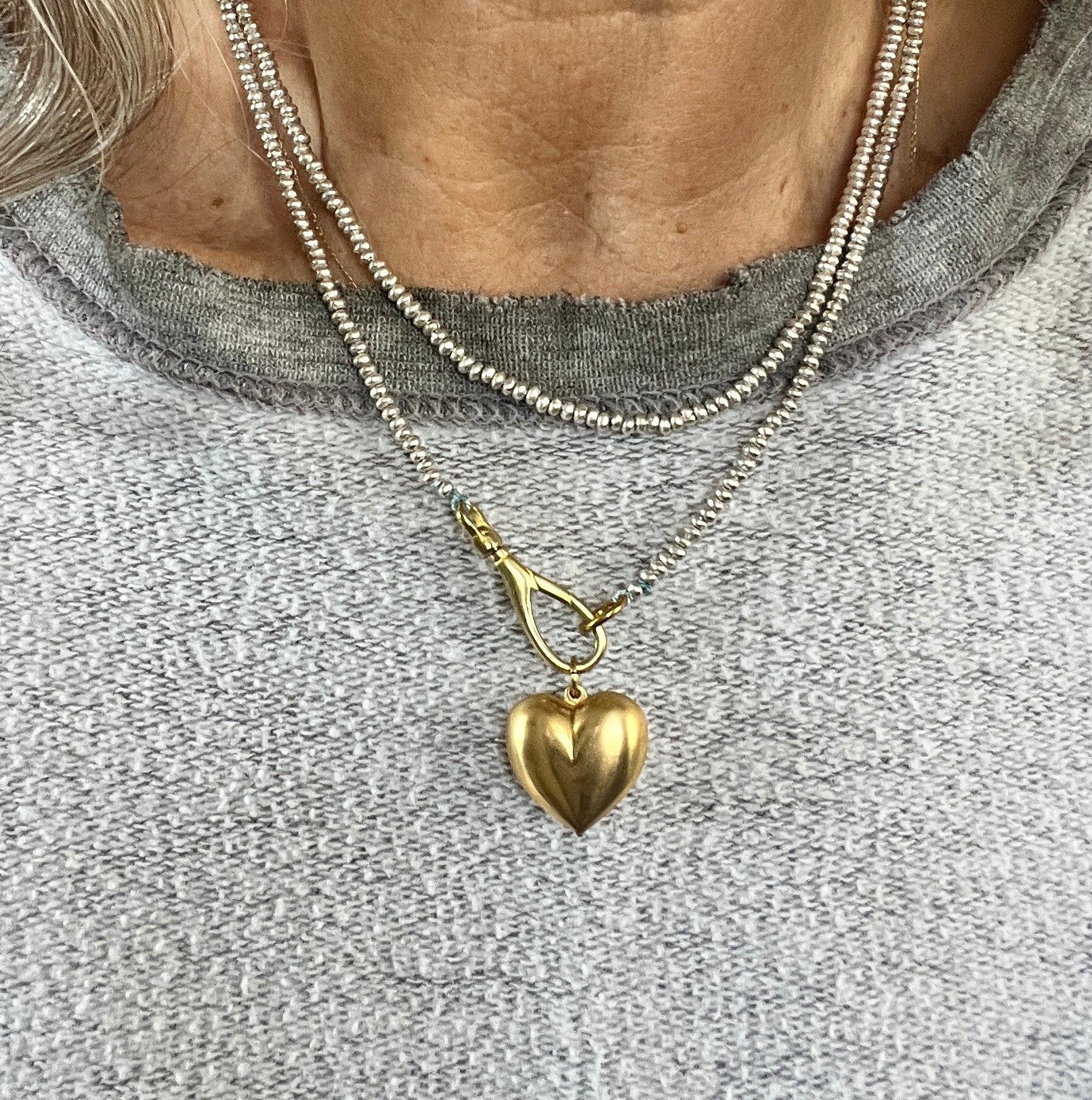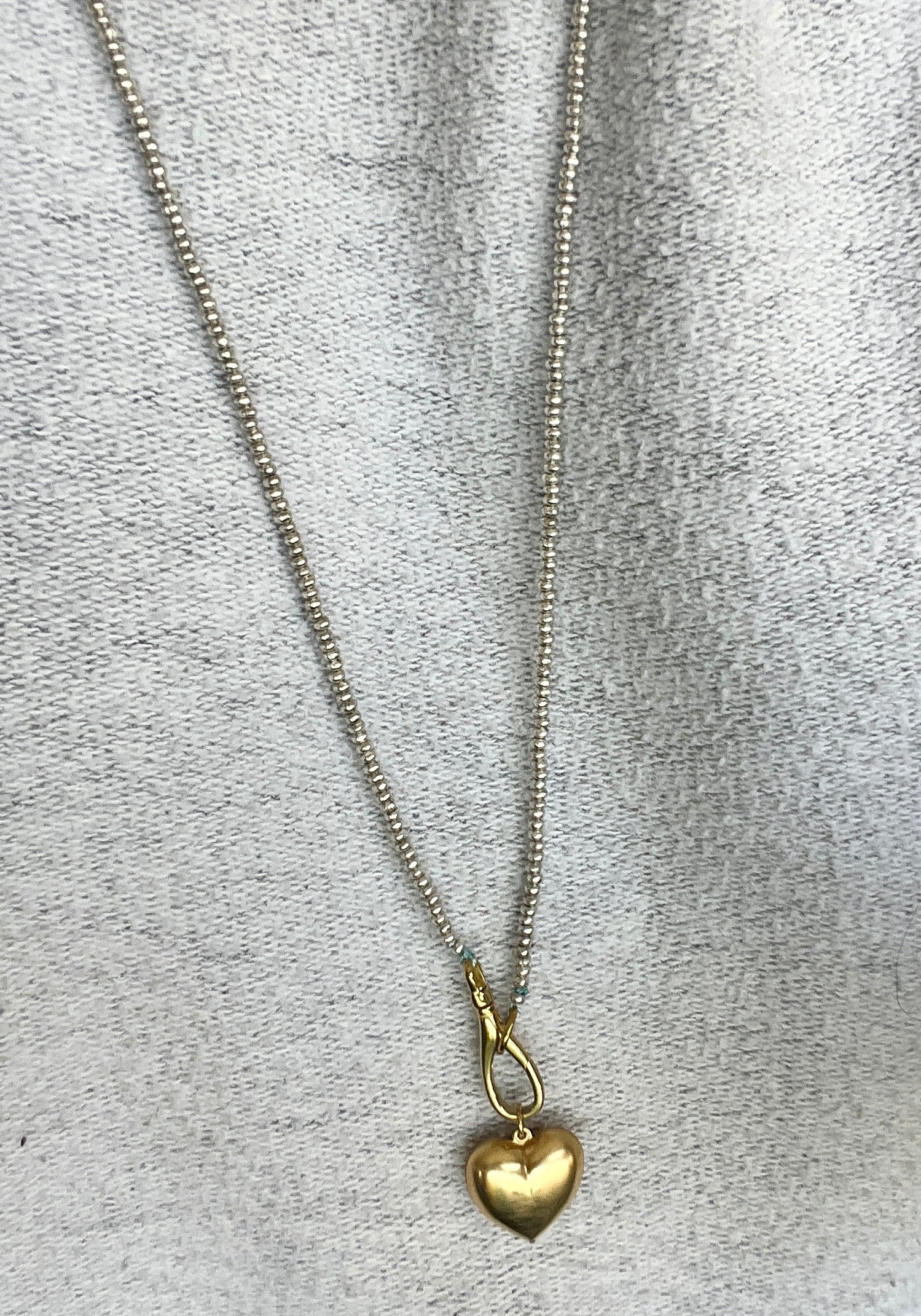 The brass puffy heart contrasts beautifully with the tiny silver beads strung by hand on silk