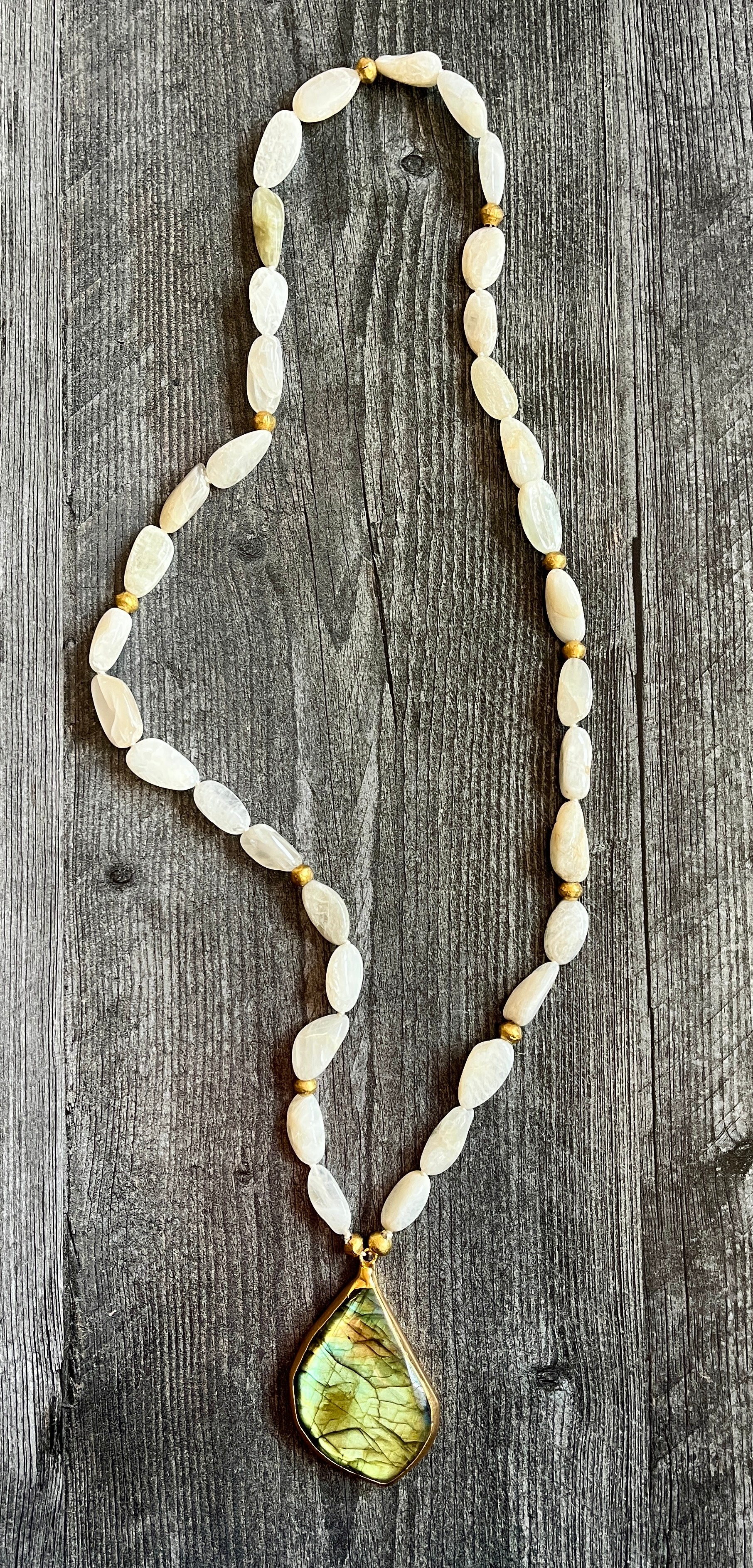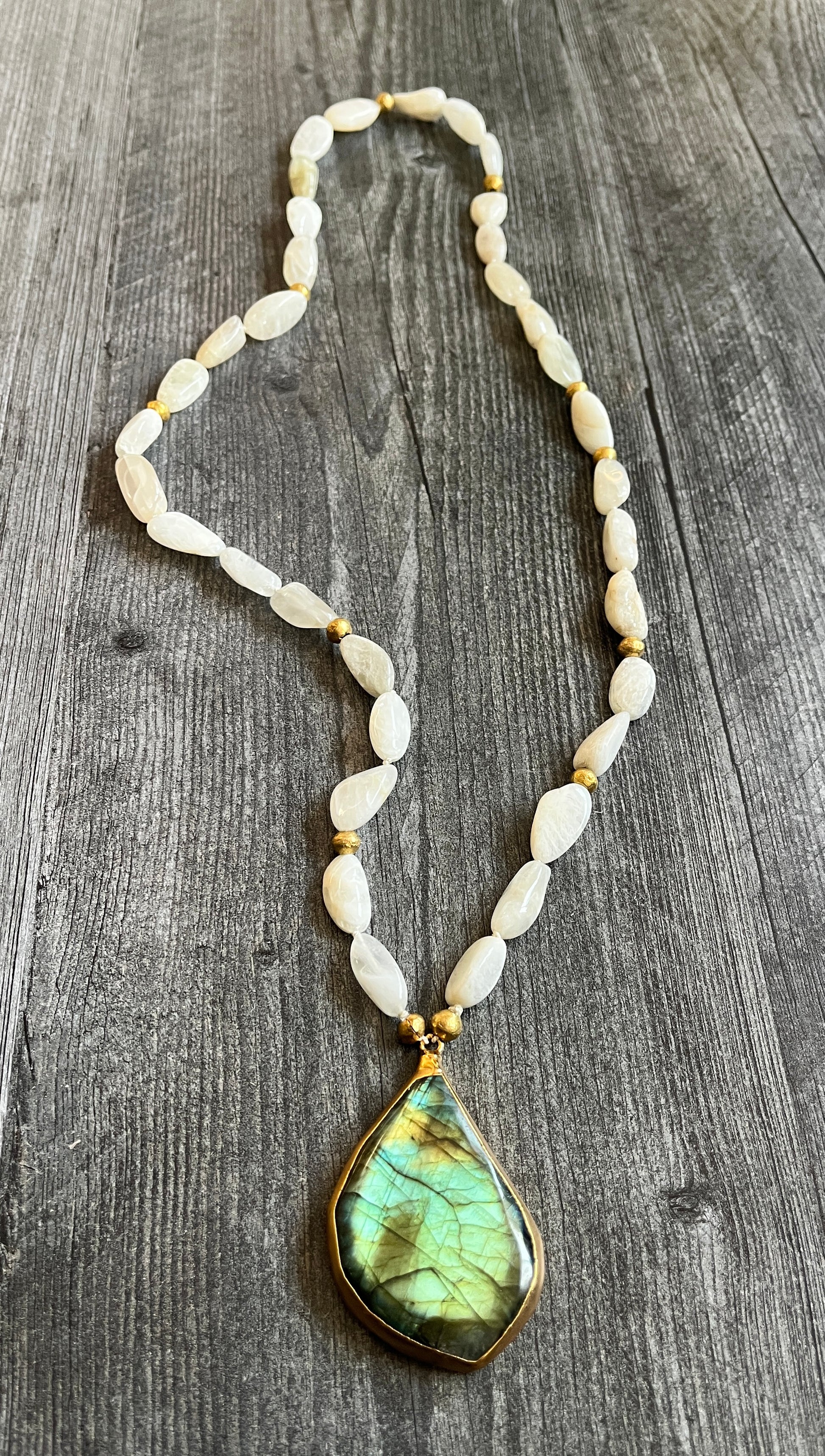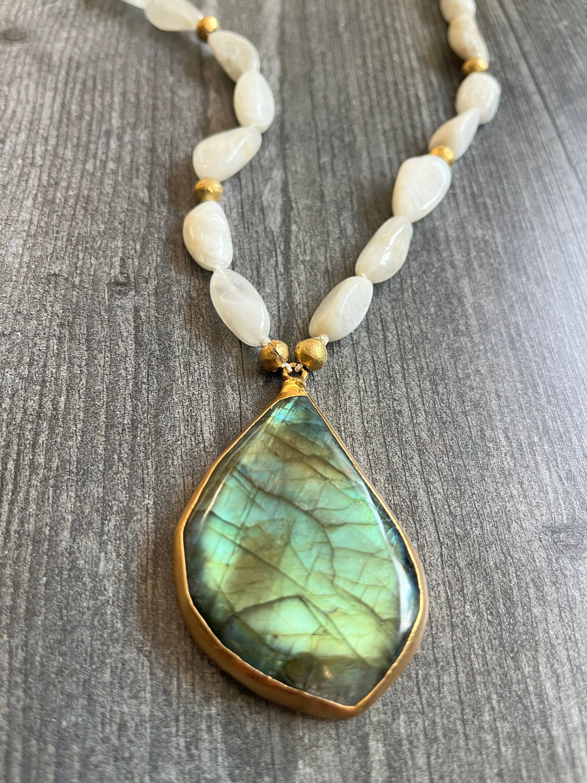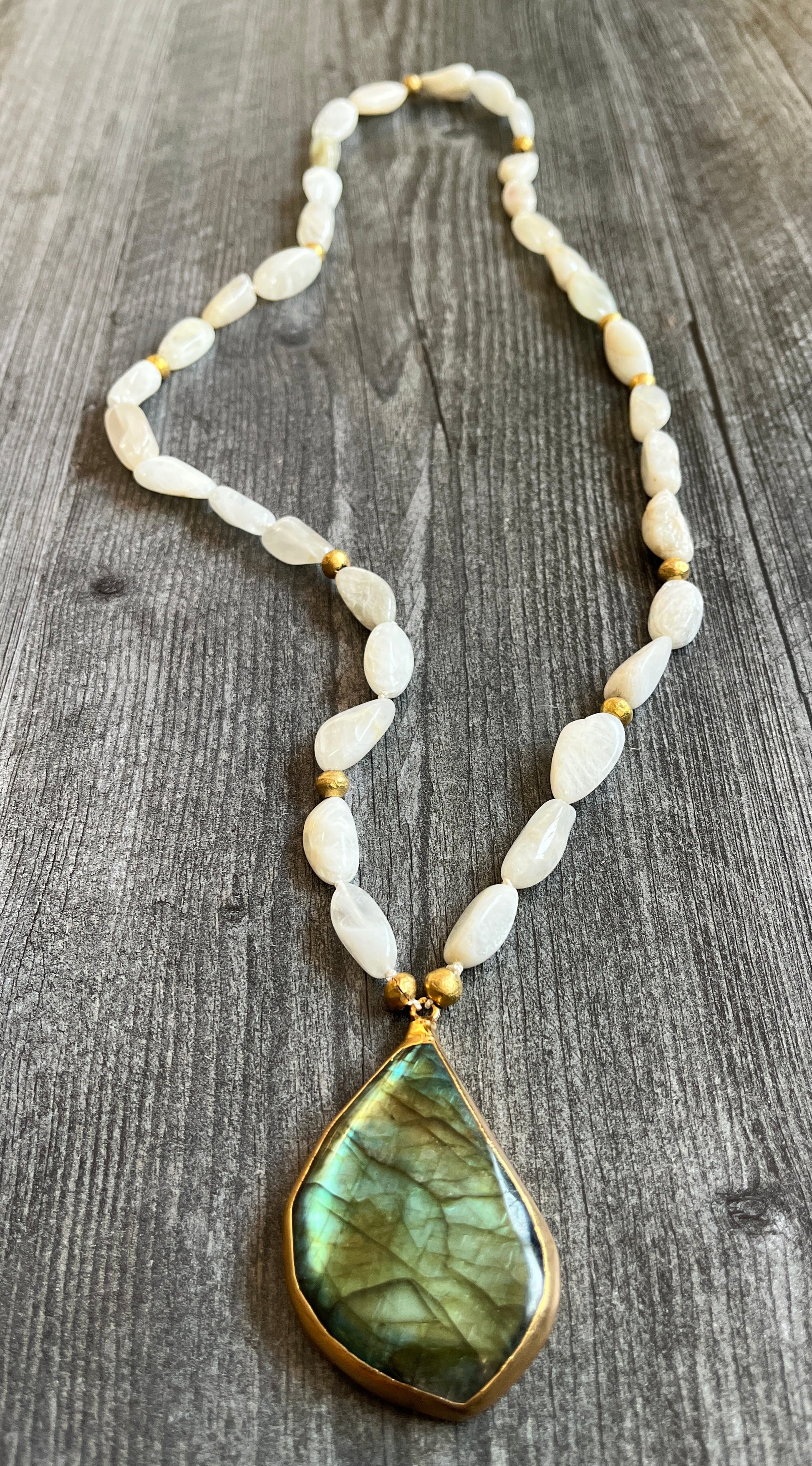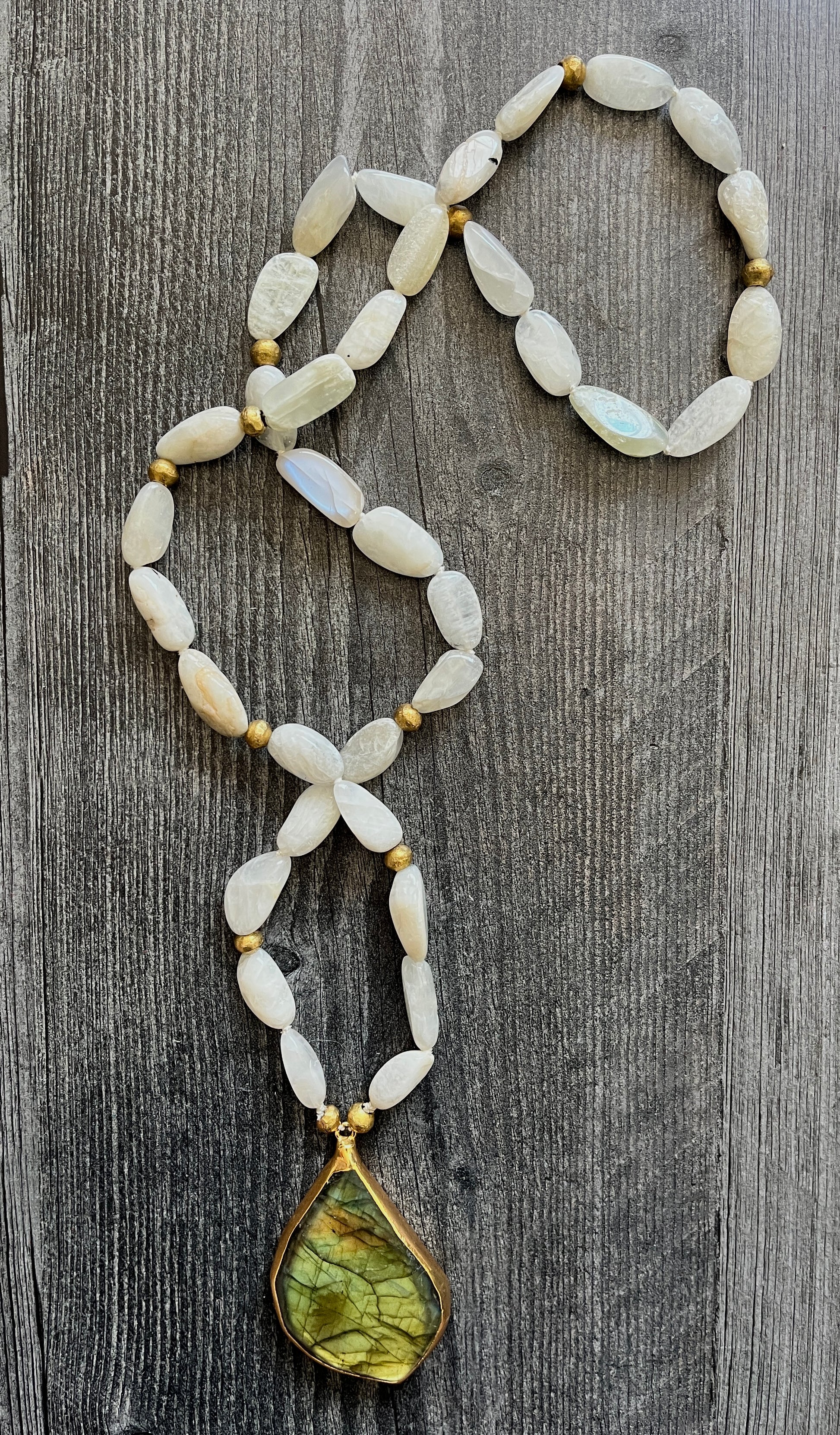 Hand knotted moonstone on silk with African brass beads and large labradorite pendant