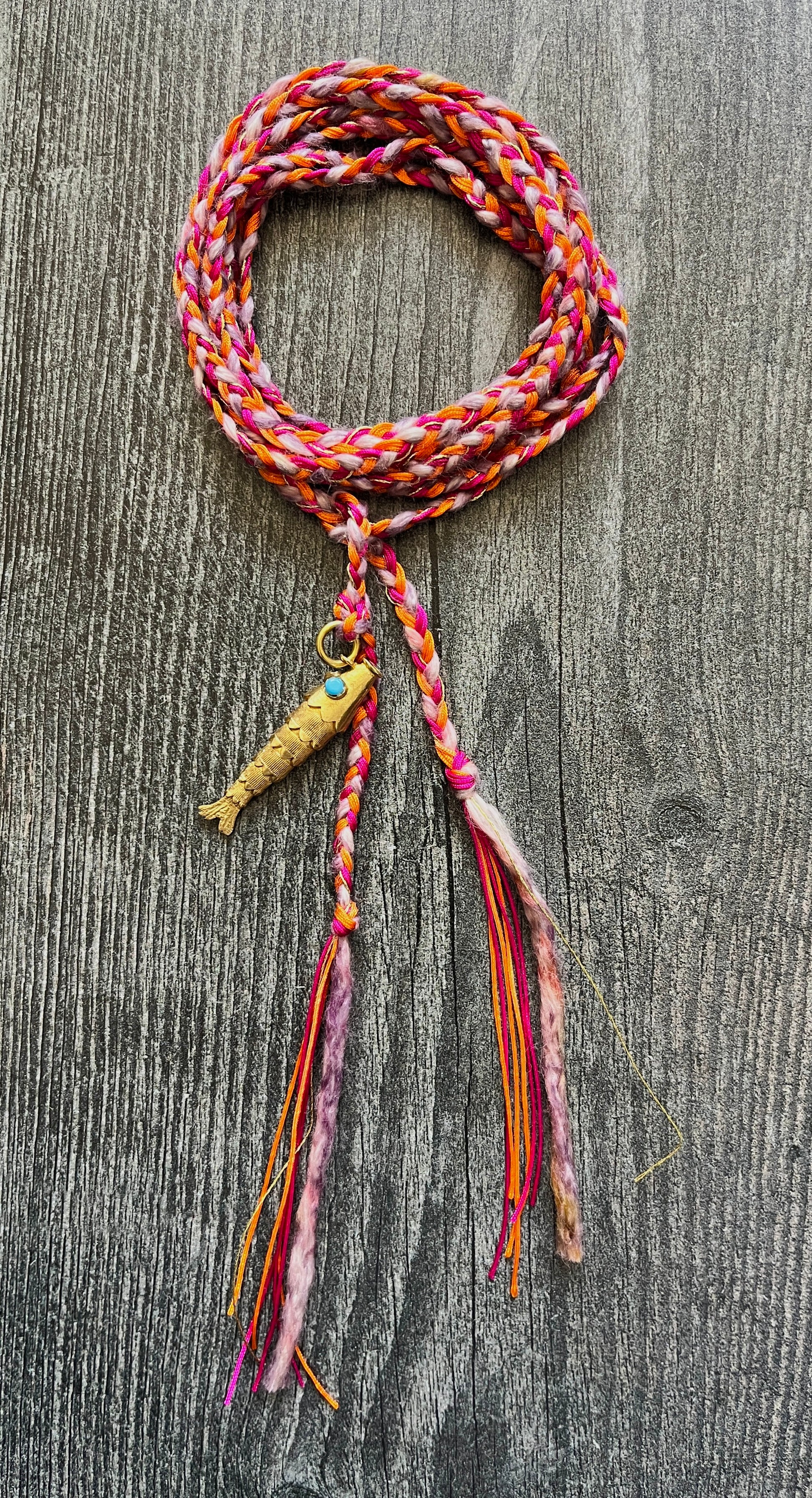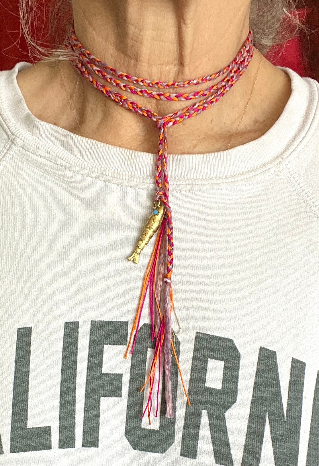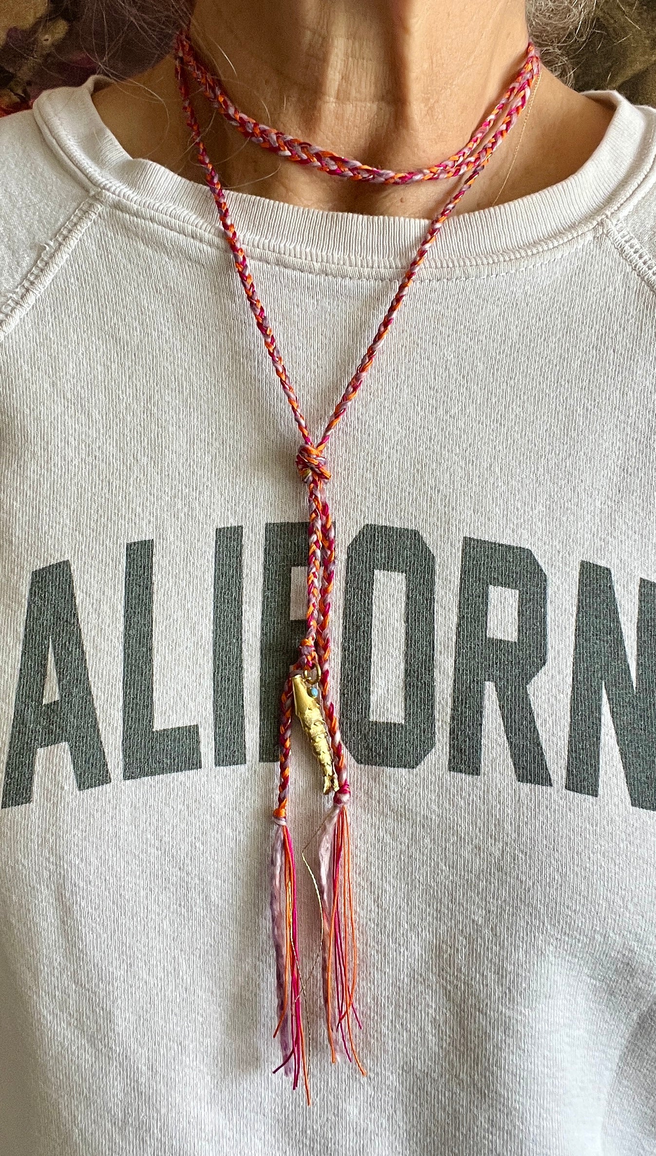 strands of woven nylon & cotton are hand braided, with a vintage 18k gold dipped articulating fish