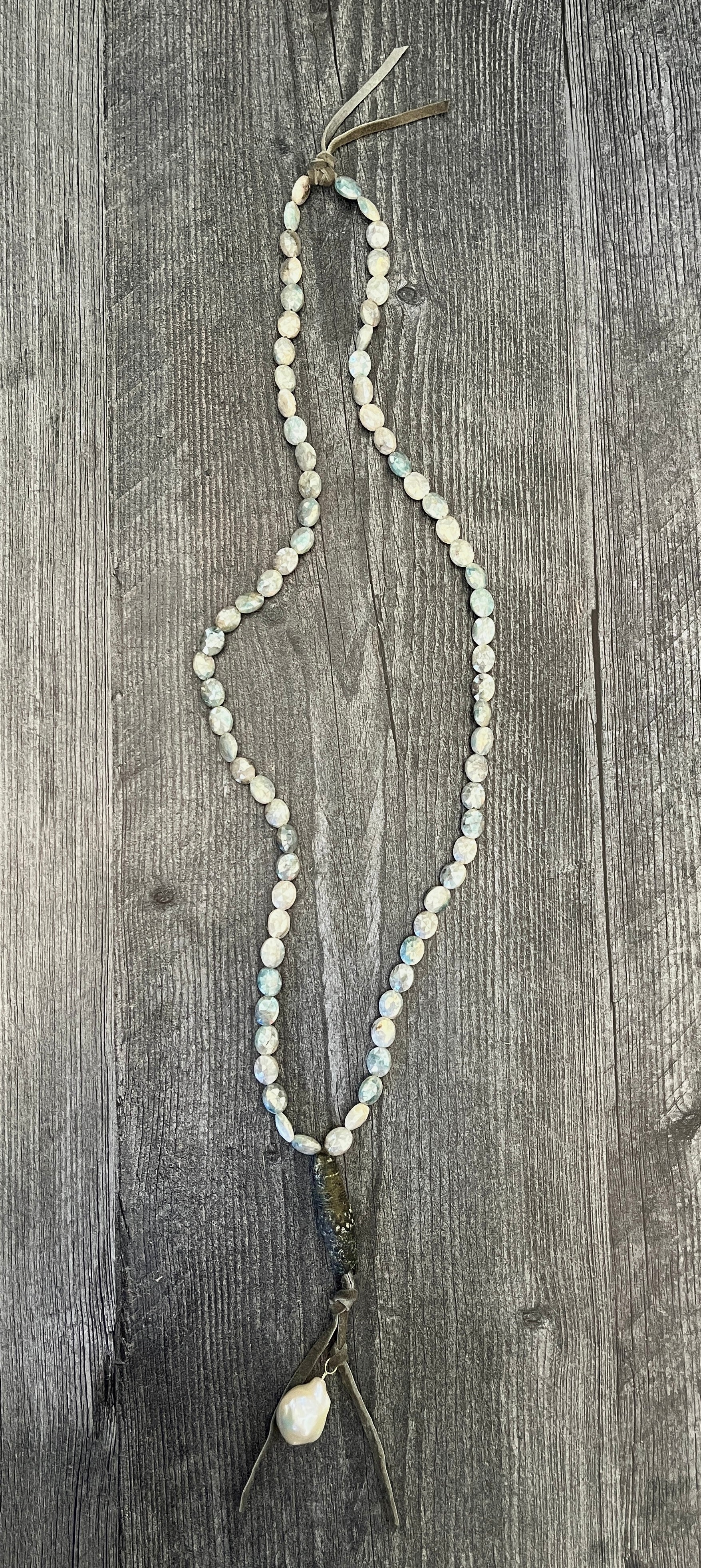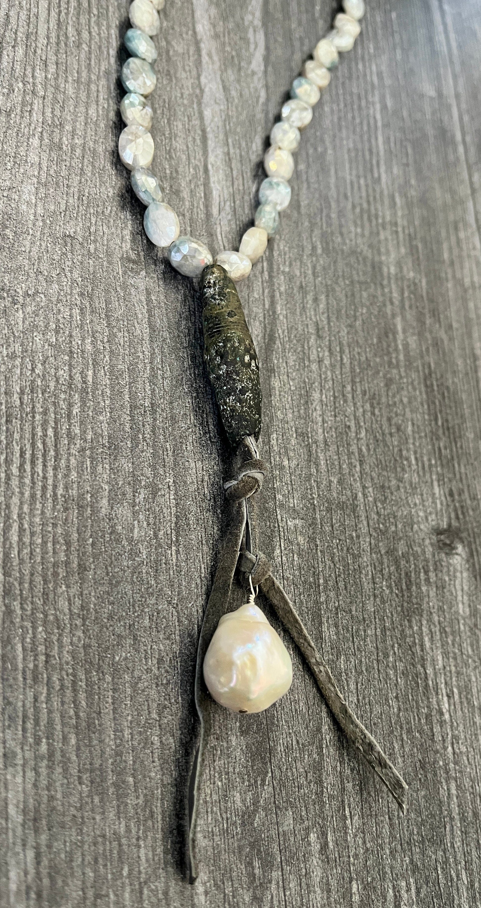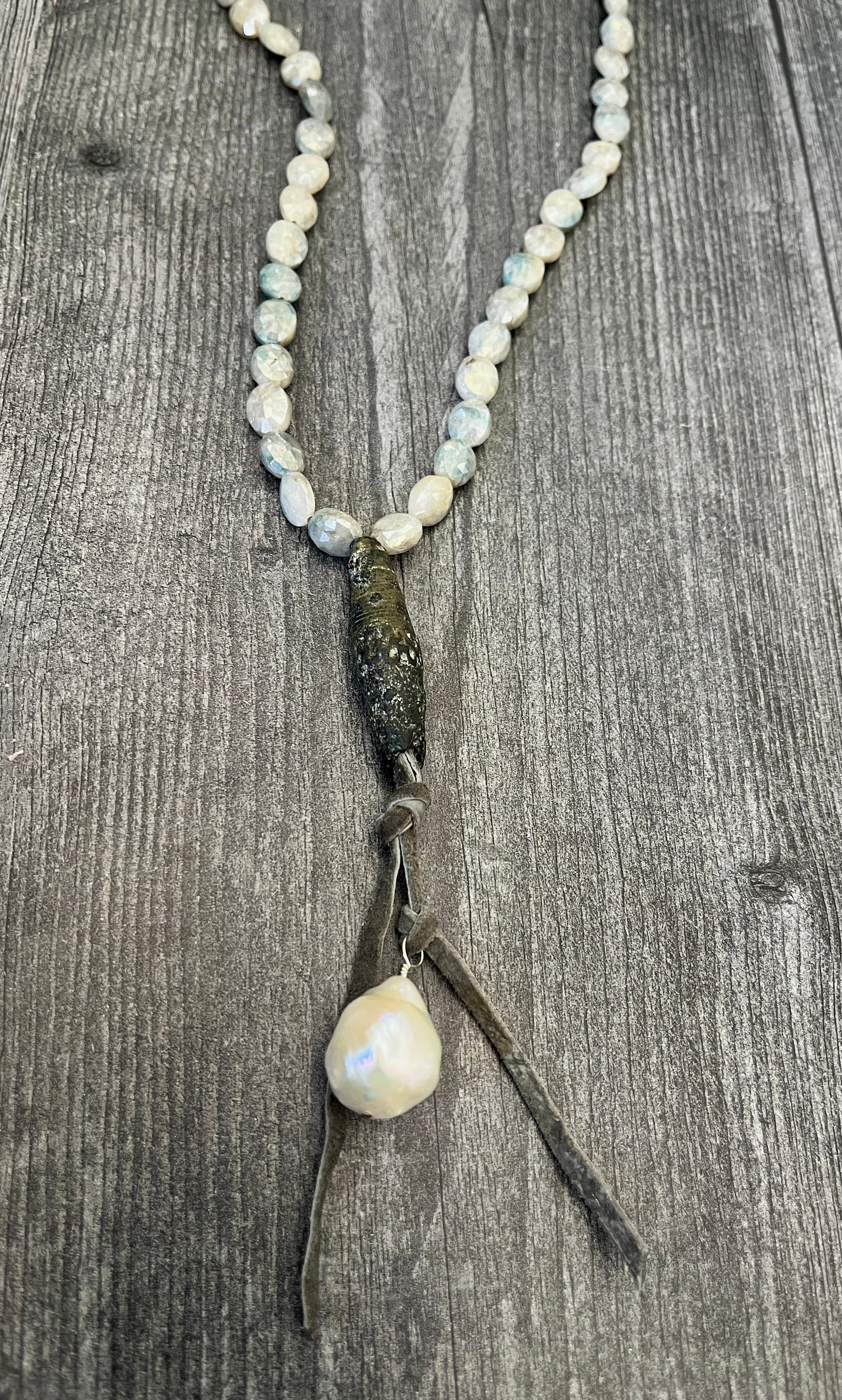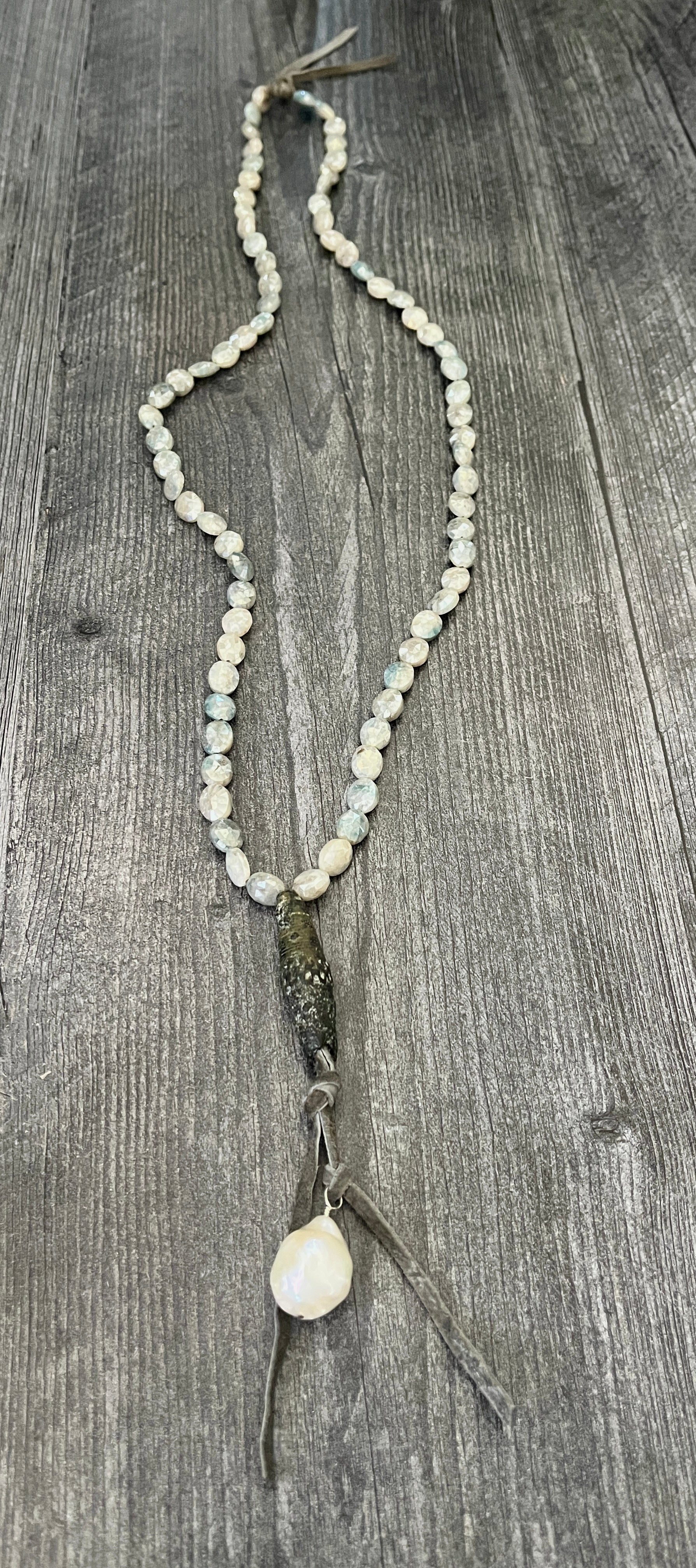 The luminescent stones have an ancient metal bead and large freshwater pearl with soft suede fringe