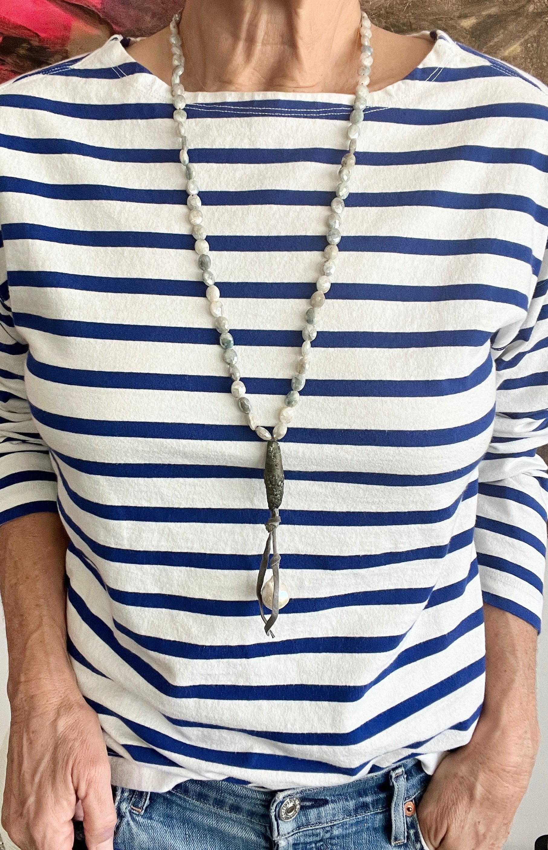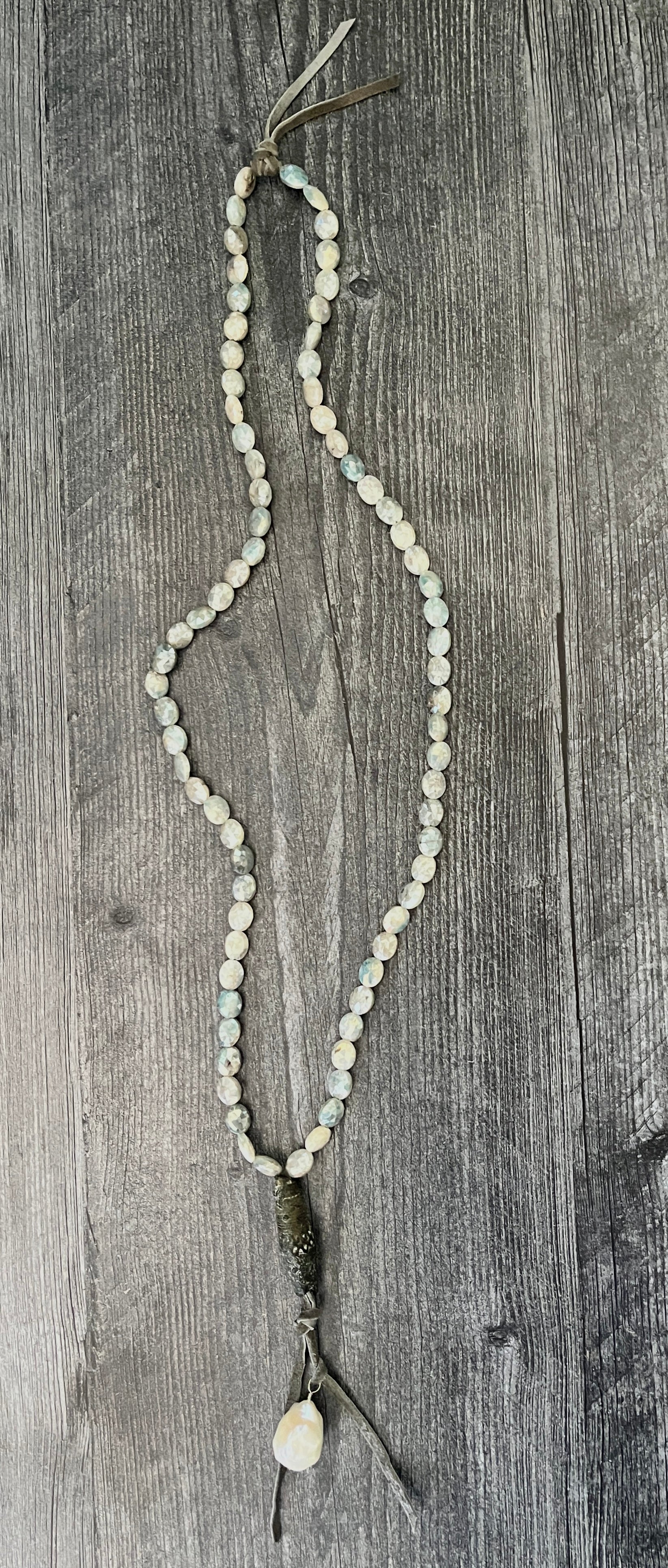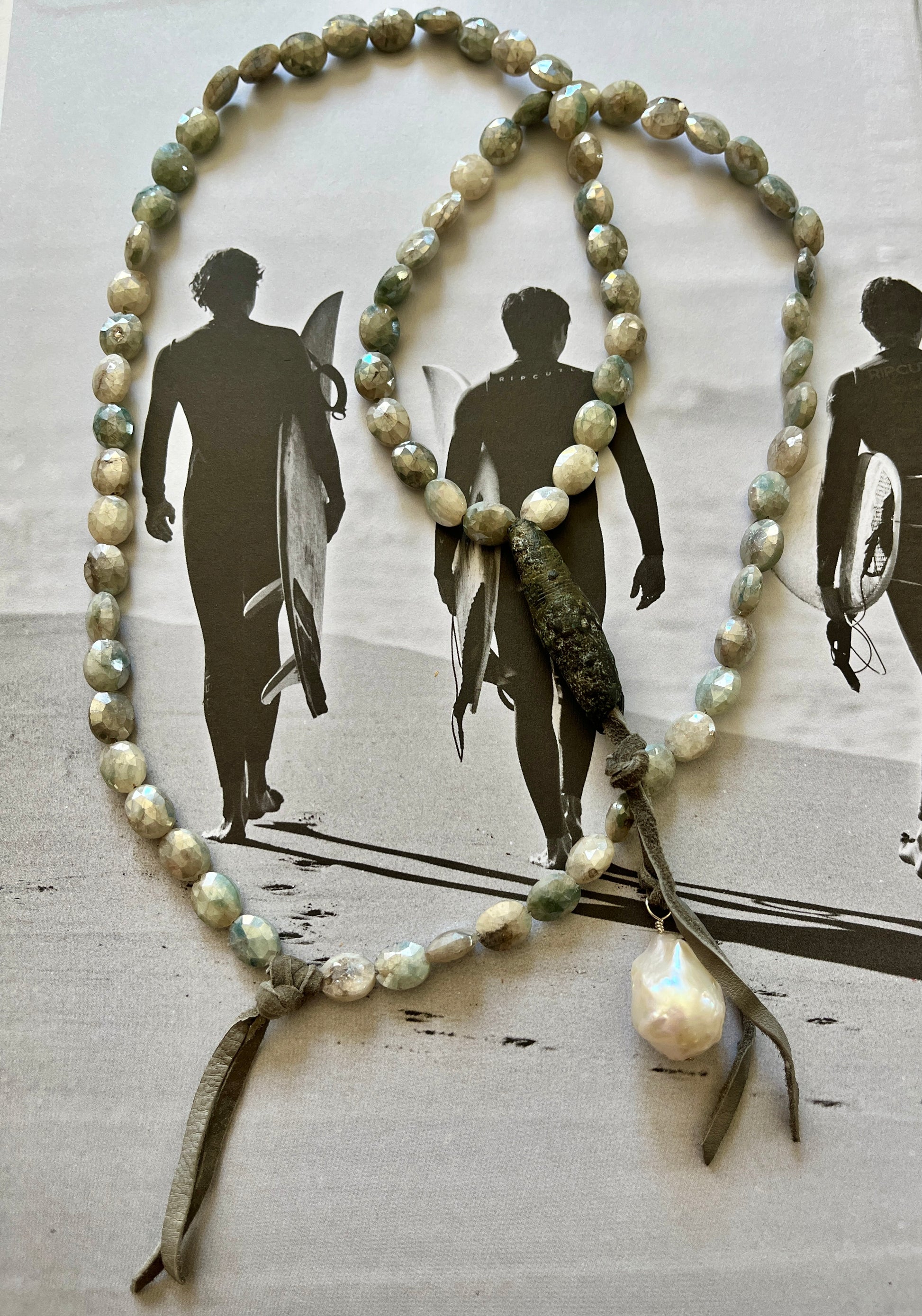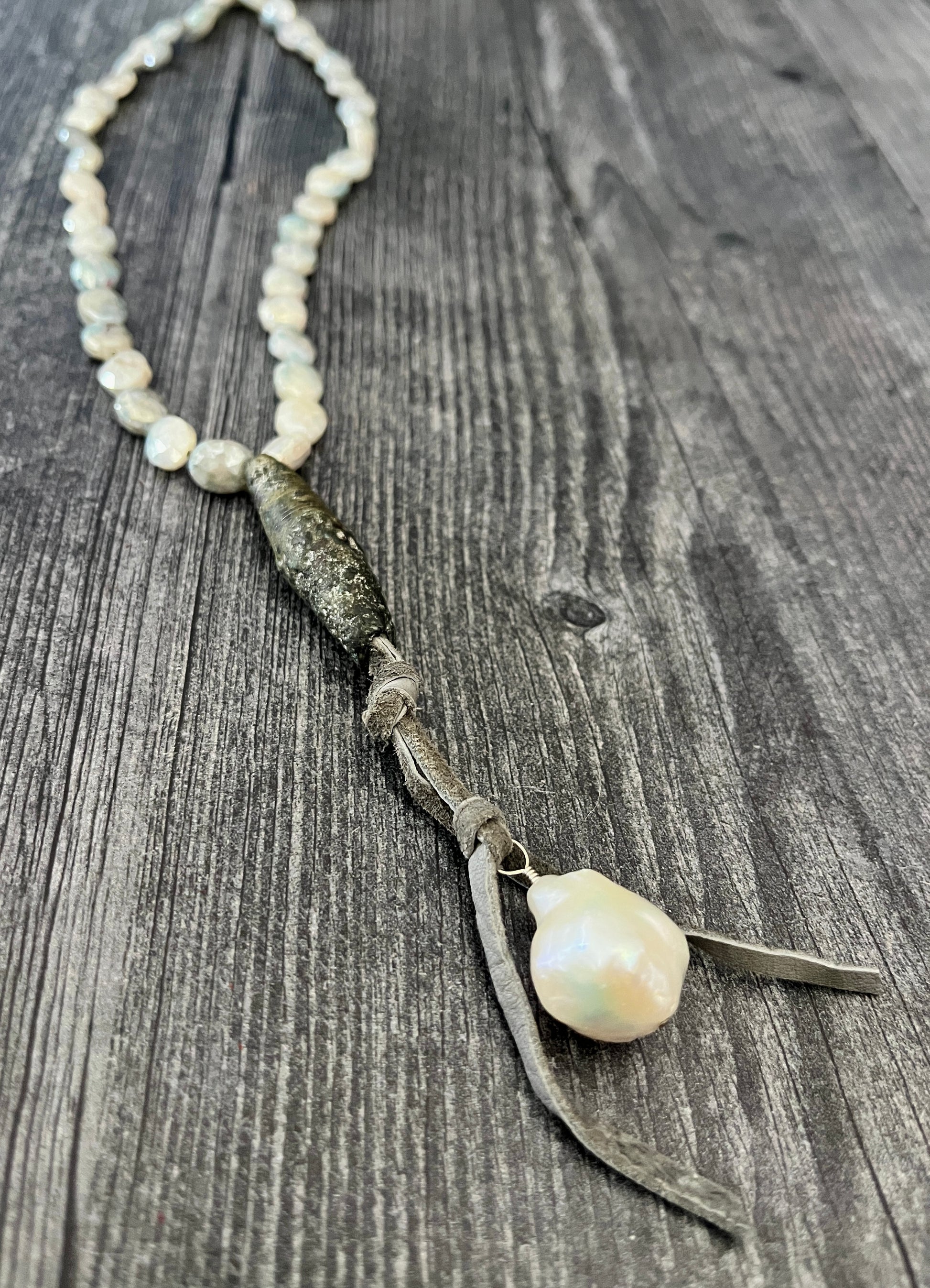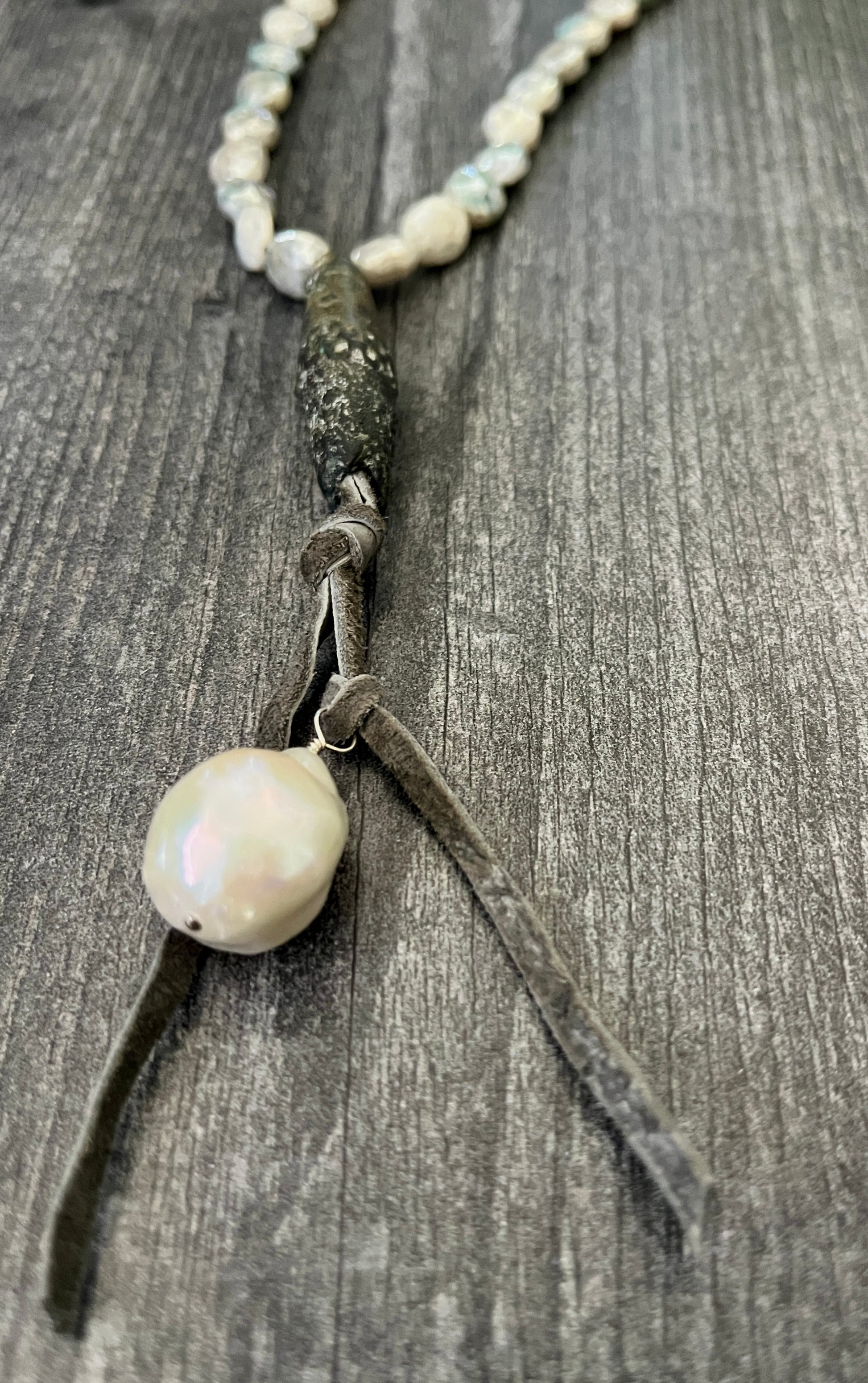 The luminescent stones have an ancient metal bead and large freshwater pearl with soft suede fringe